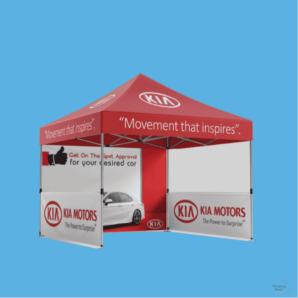 They include 4 fabric panels that can feature up to 4 different designs (one for each side). Each panel is sewn together and set up on a 10’ x 10’ (120″ x 120″) aluminum pop-up canopy tent. It is required you use our templates for designing your Event Tent.